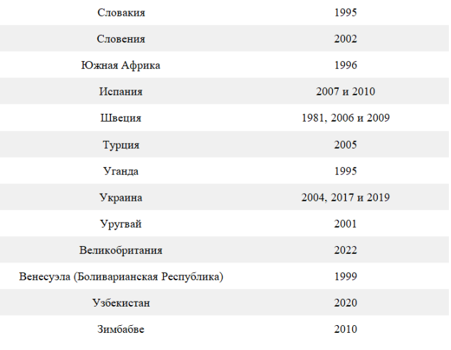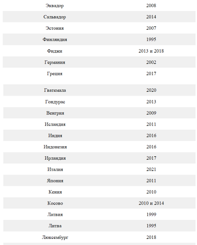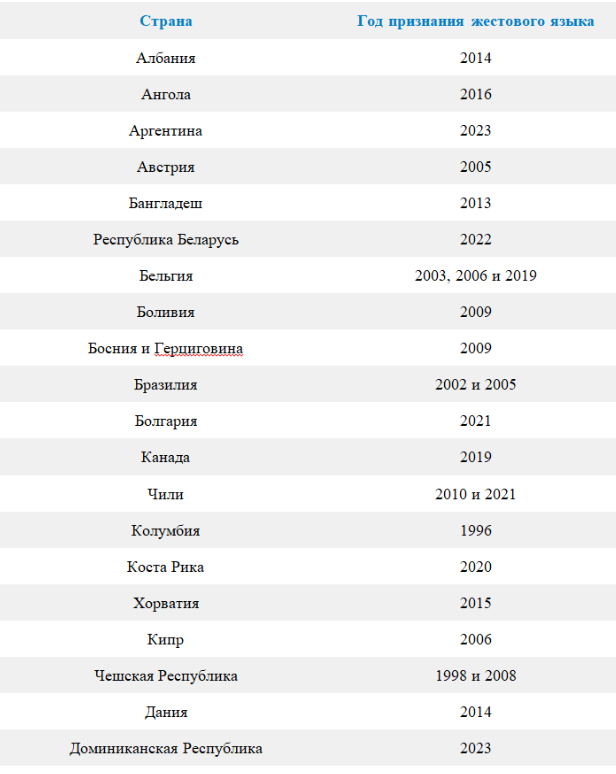 Для удобства понимания ниже представлен перечень из 77 стран и год признания в них жестового языка: